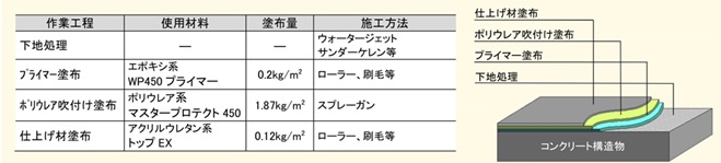コンクリート表面に、ポリウレア樹脂の速乾性と優れた弾性を有したコーティング材を吹付けることによって、はく落防止機能を有する表面保護工法です。